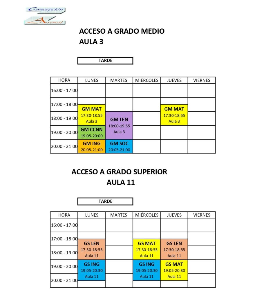 HORARIOS CURSOS DE PREPARACIÓN ACCESO GRADO MEDIO Y GRADO SUPERIOR