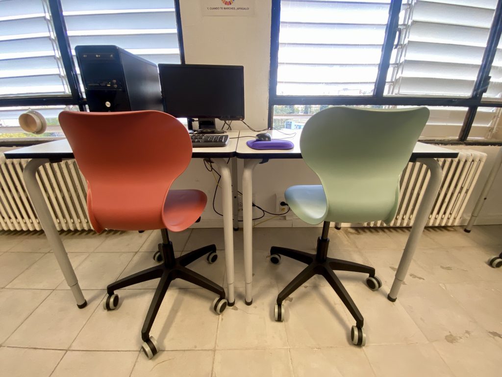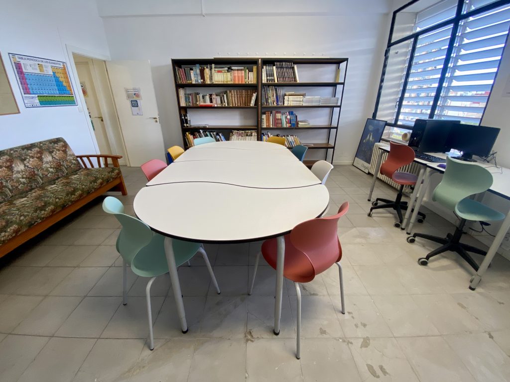 Disponéis de una gran mesa de trabajo común en grupo o de estudio individual. Se pueden distribuir de varias formas según las necesidades que surjan.